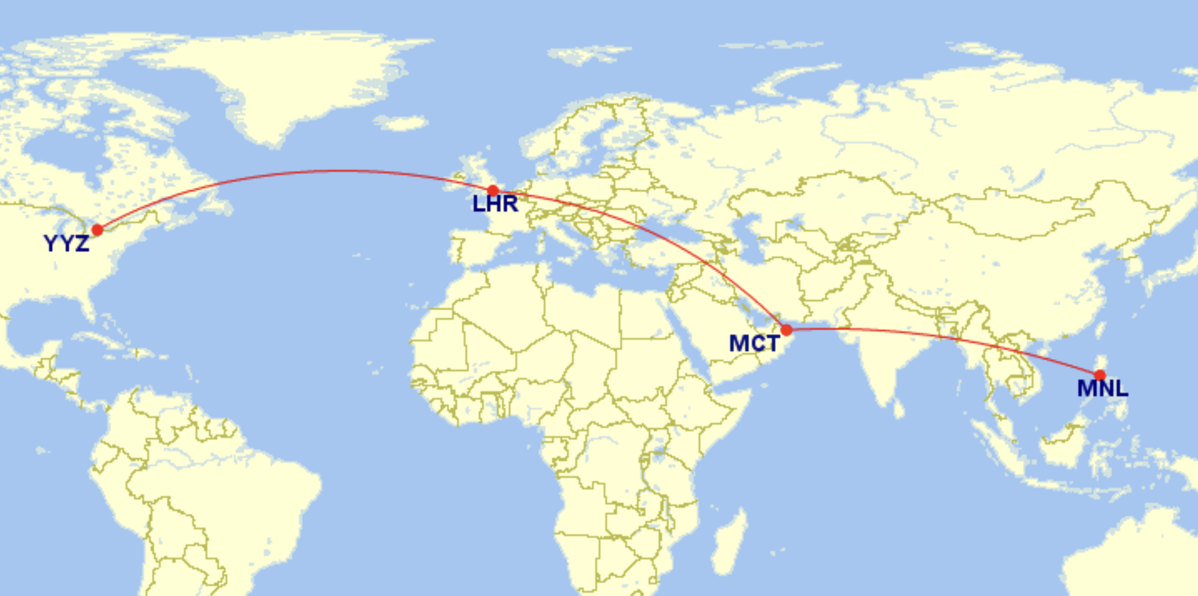 For example, flying from North America via London to Muscat, and then onwards to Manila in Oman Air business class, would cost 85,000 Aeroplan points one-way from the East Coast and 105,000 Aeroplan points from the West Coast.