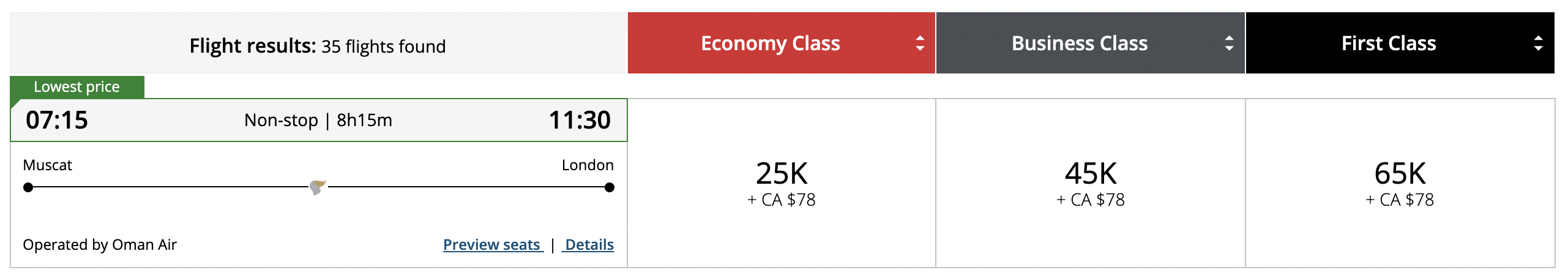 Currently, the only destinations with First Class are London and Kuala Lumpur (on the Boeing 787) and Frankfurt (on the Airbus A330). First Class from Europe to Muscat will cost 65,000 points, whereas the flight to Kuala Lumpur would cost 80,000 points.