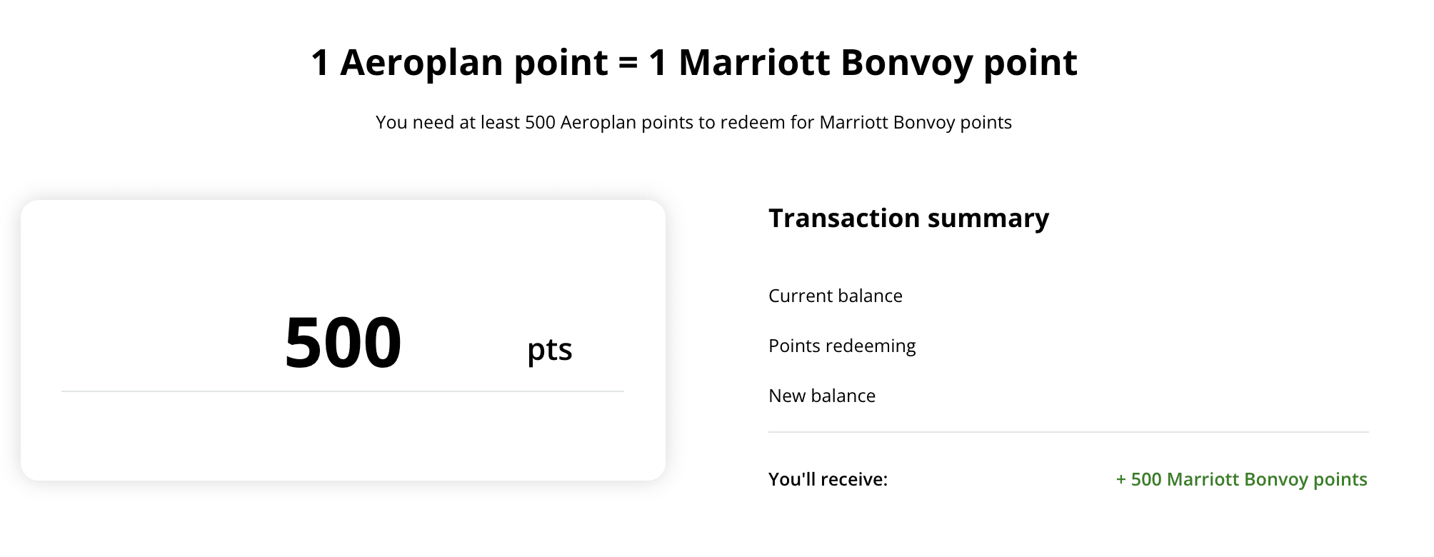 Then, enter in the amount of Aeroplan points you wish to transfer to Marriott Bonvoy points at a 1:1 ratio. The number of Marriott Bonvoy points you’ll receive, as well as the remaining balance in your Aeroplan account, are displayed.