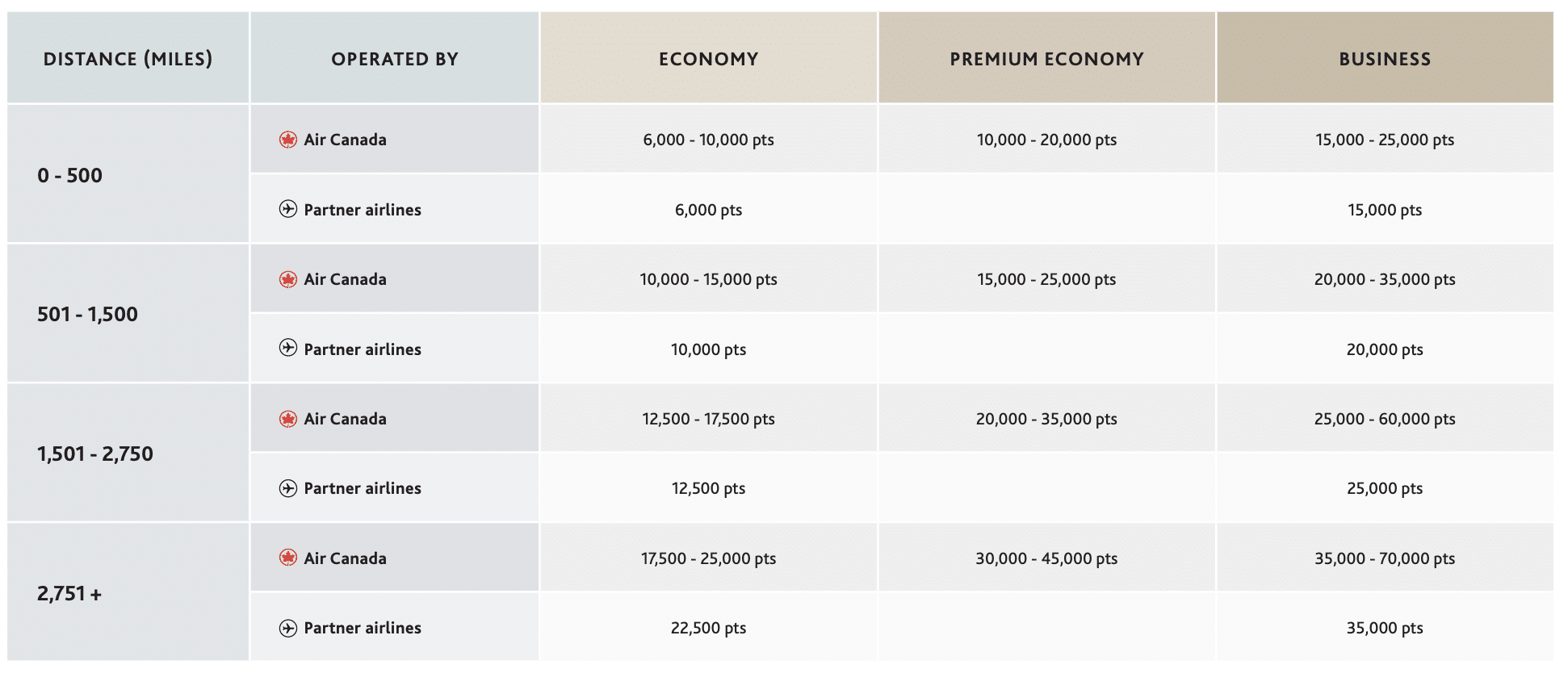 For example, a flight between Vancouver and Calgary measures around 428 miles, and we’d consult the 0–500 miles distance band to get an idea of what flights should cost. In this case, if flights price out at or below 6,000 points in economy or 15,000 points in business class, you know you’re getting a good deal.