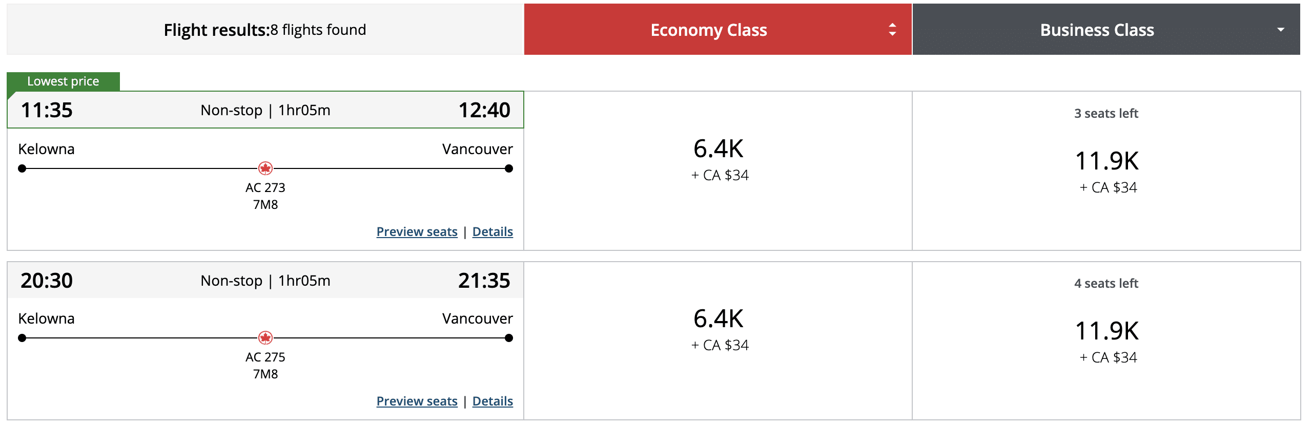 For example, there are business class flights from Calgary to Vancouver for around 11,000 Aeroplan points:
