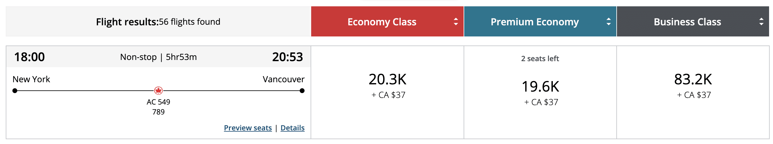 There are plenty of dates to fly in premium economy from Newark to Vancouver for around 19,000 points, although business class pricing shows as above the upper end of the dynamic range in the below example.