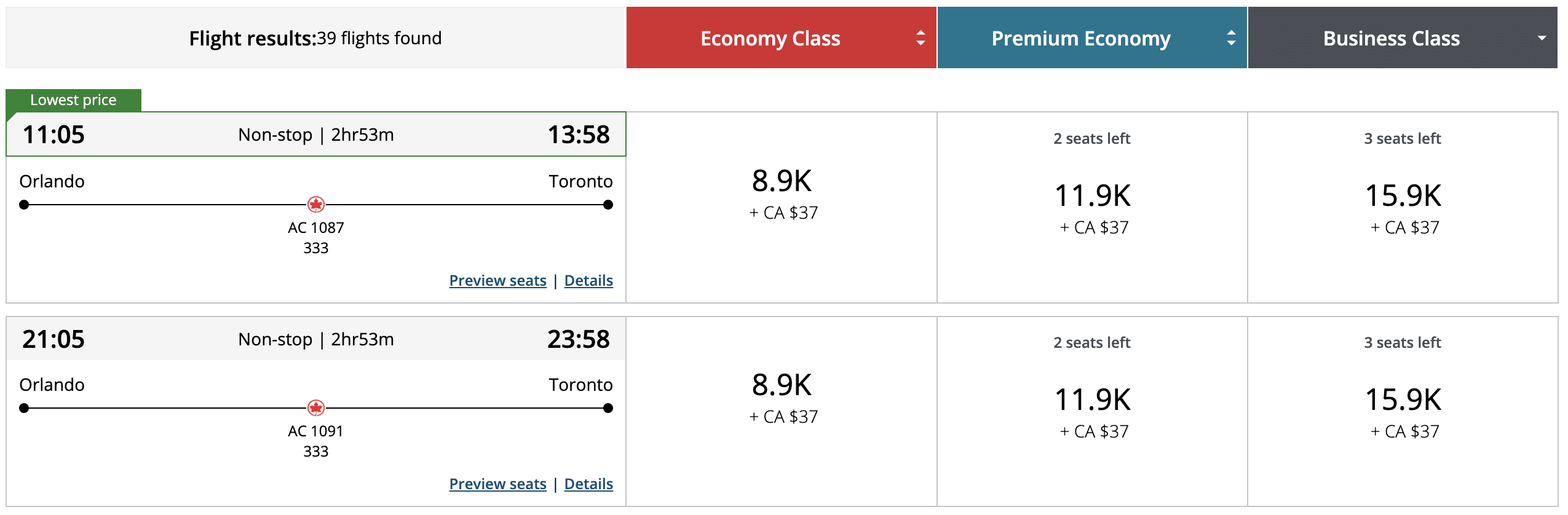 You could fly from Orlando to Toronto for around 9,000 points in economy, 12,000 points in premium economy, or 16,000 points in lie-flat business class!