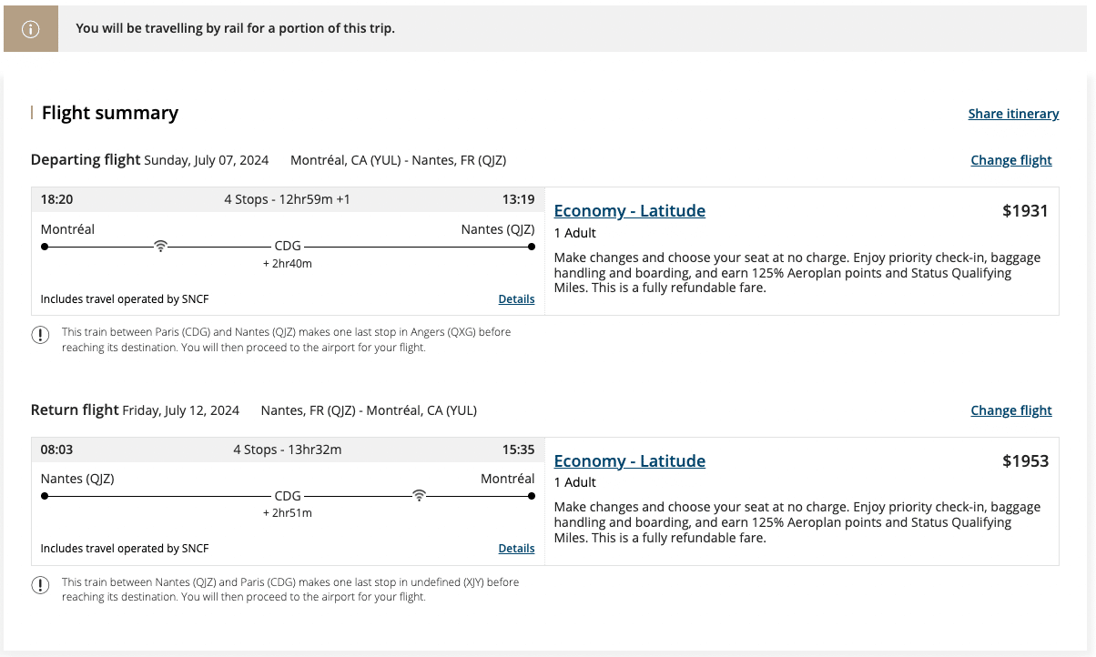 On the fare summary page, you can see all of the information about your trip, with the rail service connected to the air service in both directions.