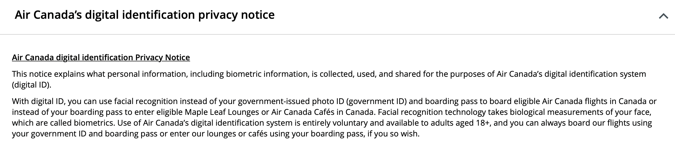 There is an extensive section about privacy on Air Canada’s digital ID website, so be sure to give it a thorough read before opting in to ensure you’re comfortable with everything. Note that there is both a frequently asked questions section, as well as the full privacy notice, which is towards the bottom of the page.