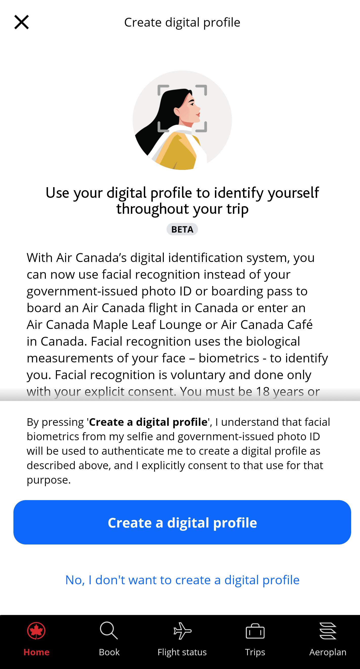 Air Canada has launched a digital identification system through the Air Canada app. Passengers can voluntarily create a digital profile prior to travel, which is then used to verify their identity at airports using facial recognition technology.