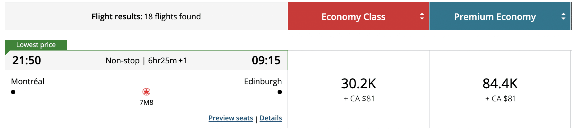 A quick glance through some of the dates shows pricing of around 30,000 Aeroplan points in economy or around 80,000–85,000 Aeroplan points in “premium economy”.