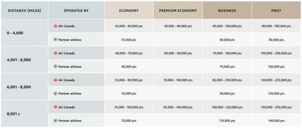 Air Canada flights booked with Aeroplan points are subject to dynamic pricing, which means that you can expect to see a range of prices rather than a fixed amount.