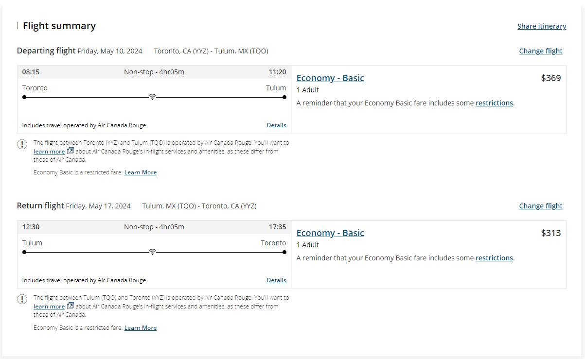 - AC1854 Toronto (YYZ) to Tulum (TQO), departing 8:15am and arriving 11:20am