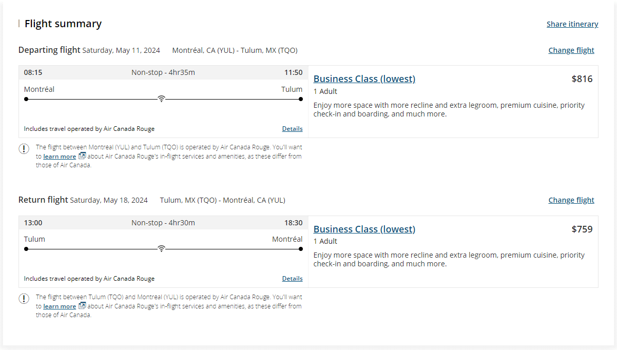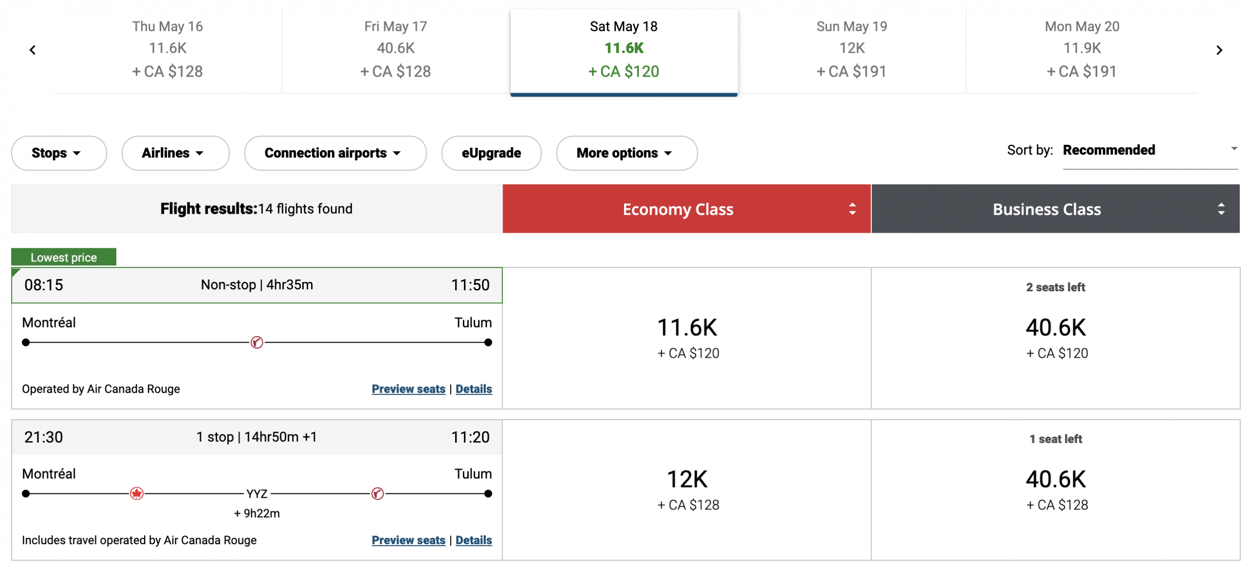 The route between Montreal and Tulum is showing introductory cash fares for around $720 (CAD) for a return ticket in economy class, and around $1,575 (CAD) in Premium Rouge.