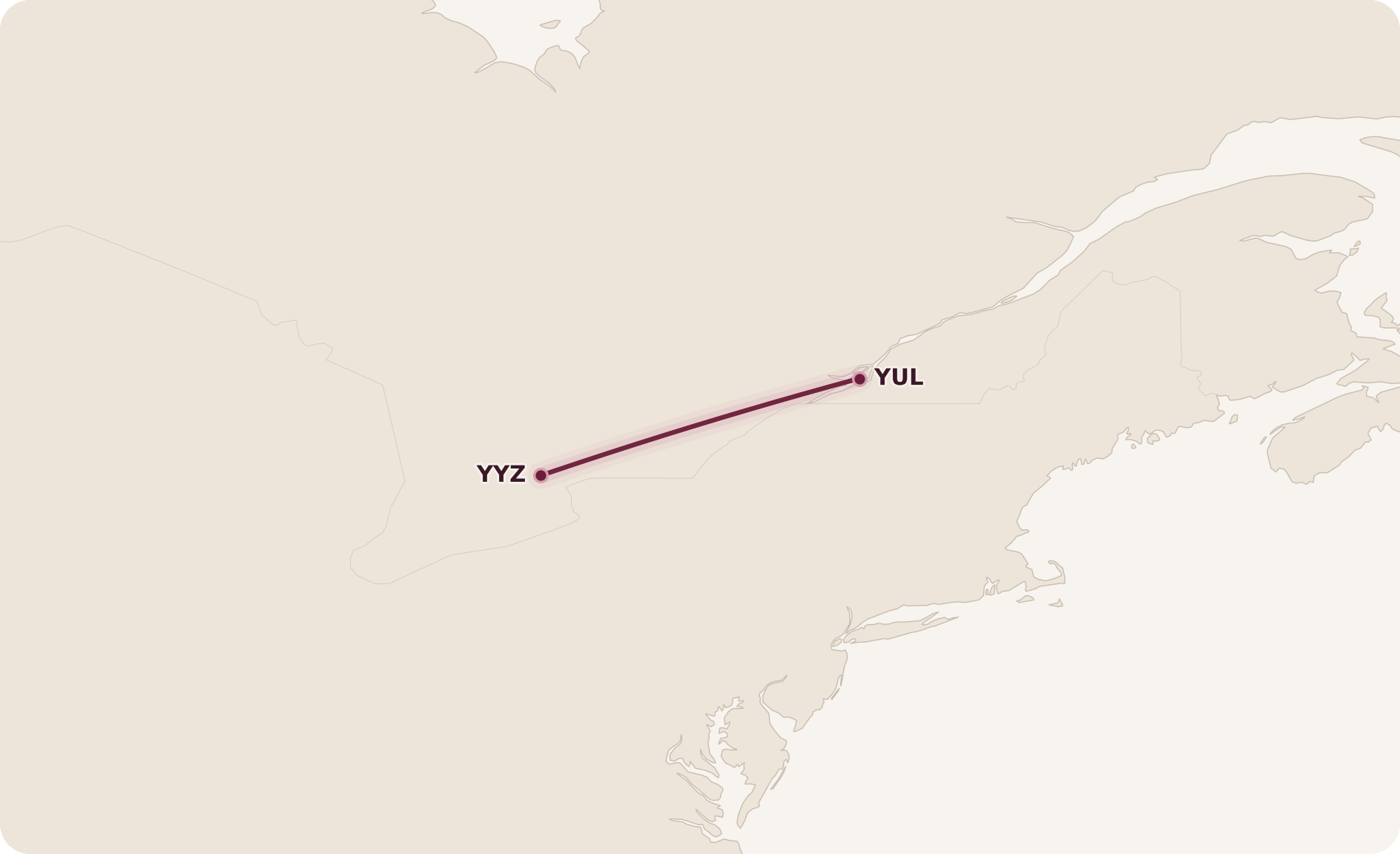 - AC1874 Montreal (YUL) to Tulum (TQO), departing 8:15am and arriving at 12:00pm