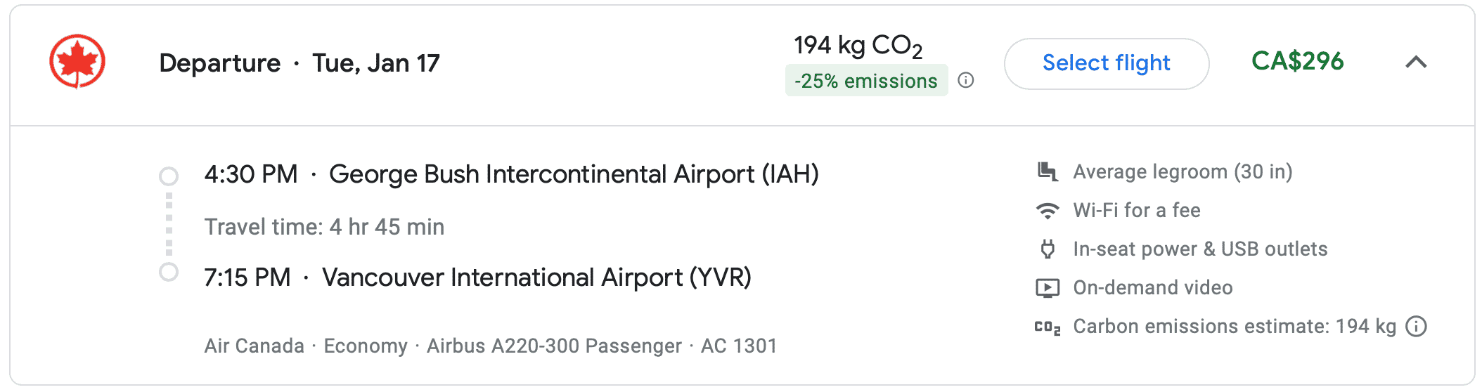 AC1301 Houston (IAH) to Vancouver (YVR), departing 4:30pm and arriving 7:15pm