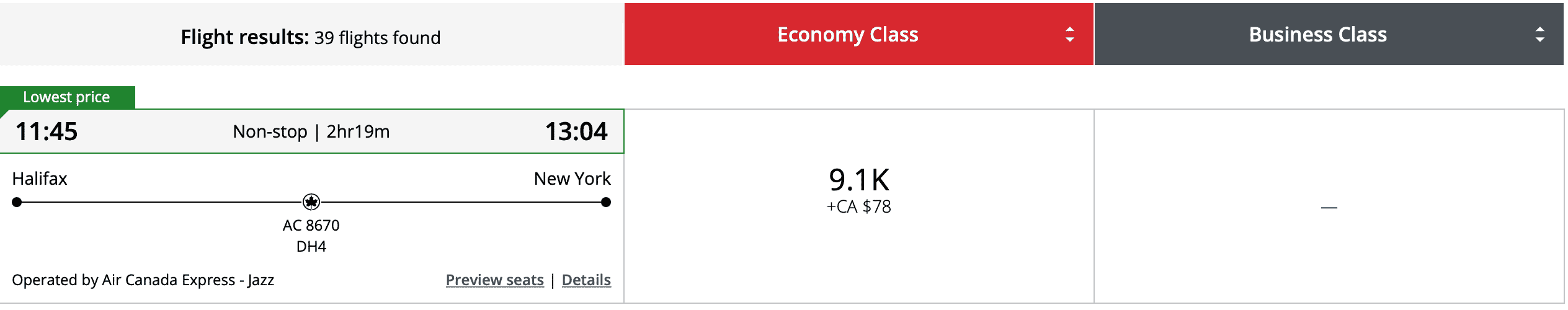 The Halifax–New York (Newark) route measures just 613 miles. This would place it in the second distance band, meaning that a one-way flight should begin at 10,000 points in economy.