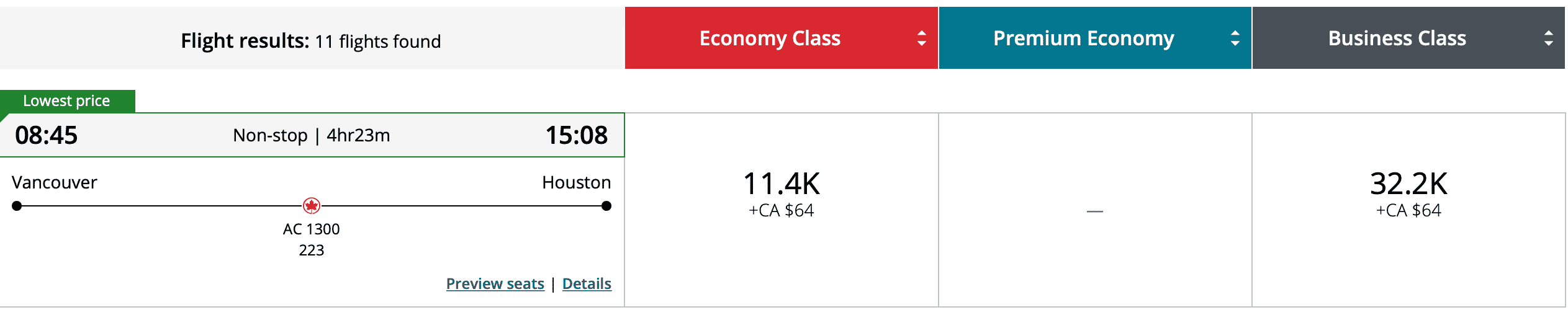 For the Vancouver–Houston route, at 1,971 miles in distance, booking a flight with Aeroplan points could cost 25,000 Aeroplan points per person one-way in business class. This assumes that lower-cost business class space is available under the dynamic pricing model.
