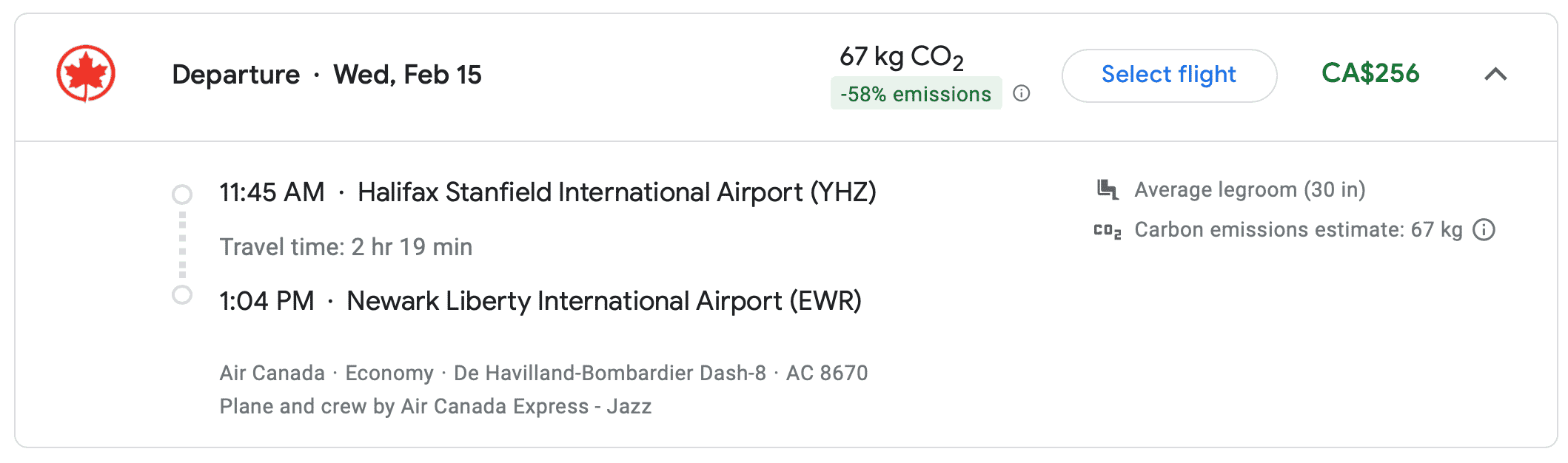 AC8670 Halifax (YHZ) to Newark (EWR), departing 11:45am and arriving 1:04pm