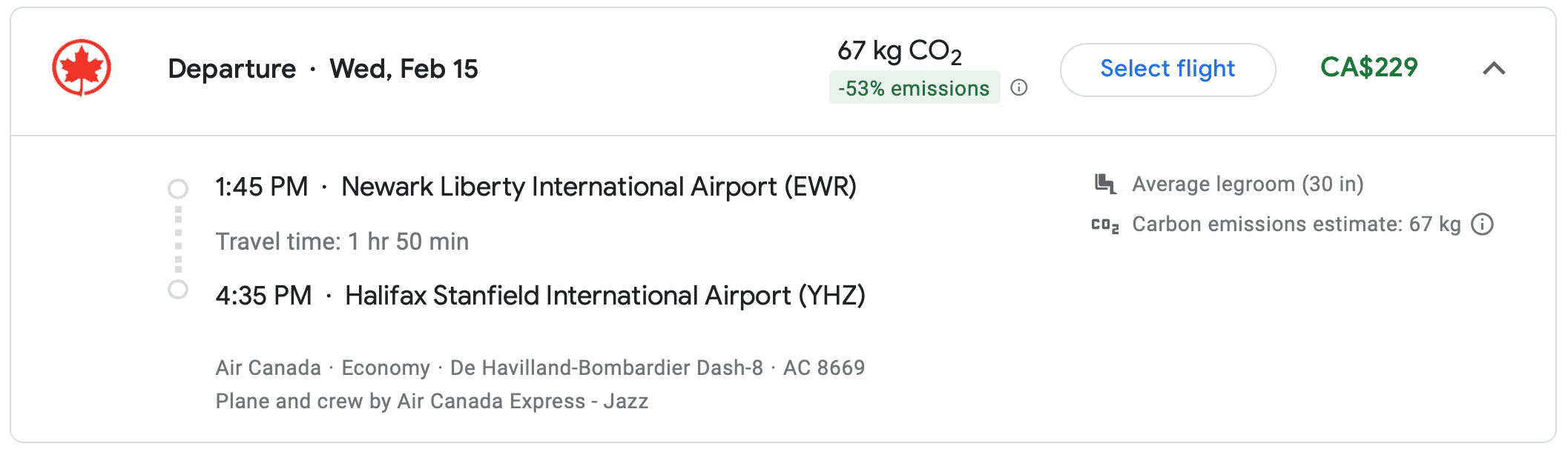 AC8669 Newark (EWR) to Halifax (YHZ), departing 1:45pm and arriving 4:35pm