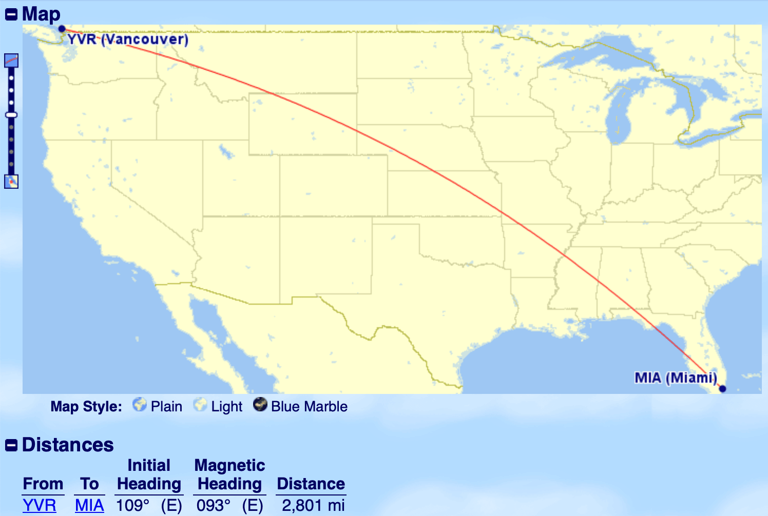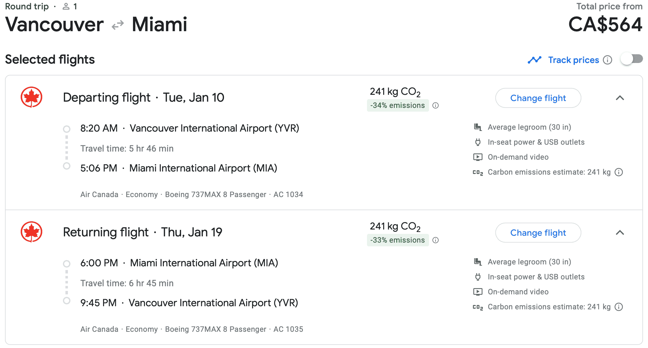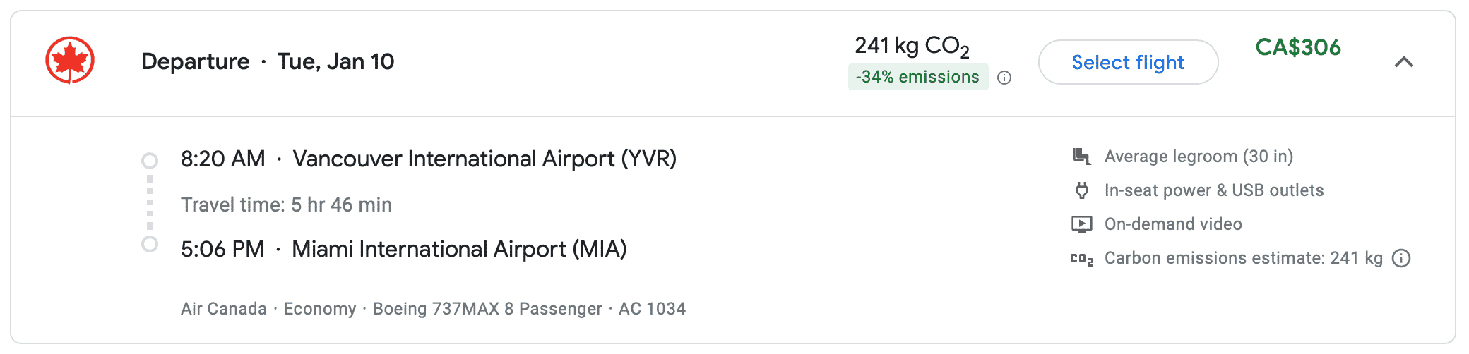 AC1034 Vancouver (YVR) to Miami (MIA), departing 8:20am and arriving 5:06pm