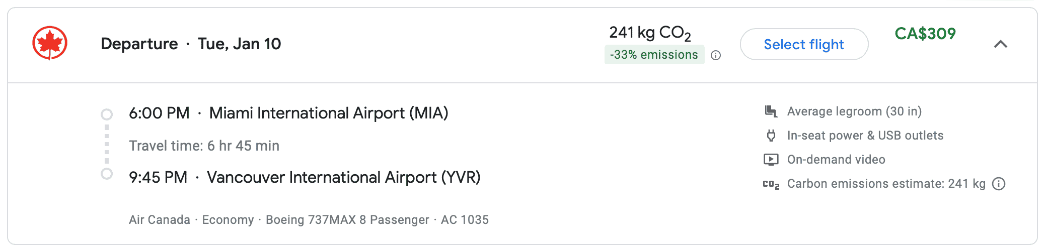 AC1035 Miami (MIA) to Vancouver (YVR), departing 6:00pm and arriving 9:45pm