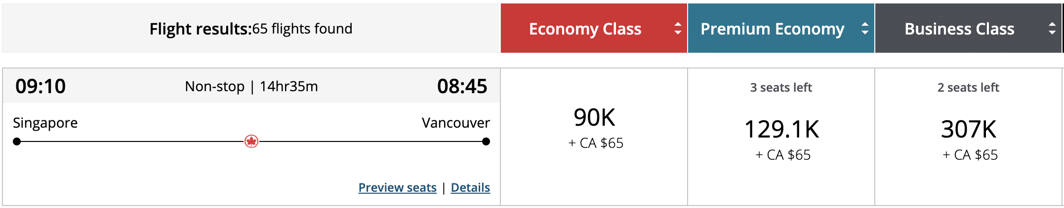 According to Great Circle Mapper, the flight between Vancouver and Singapore measures just shy of 8,000 miles. To get an idea of how much the flight might cost in points, we’d then reference the third distance band on the “Between North America and Pacific zones” section of the Aeroplan Flight Reward Chart.