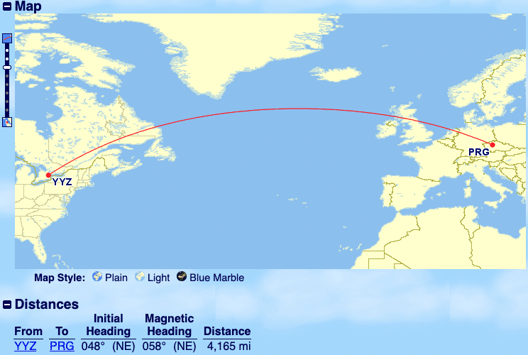 The new Toronto–Prague route covers a non-stop distance of 4,165 miles according to Great Circle Mapper.