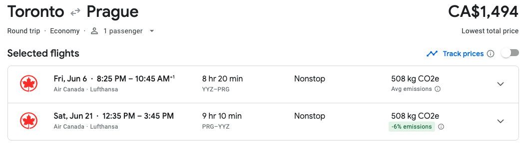 - AC934 Toronto (YYZ) to Prague (PRG), departing 8:25pm and arriving 10:45am the next day