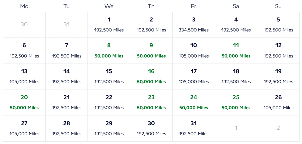 - Business class: 50,000 miles