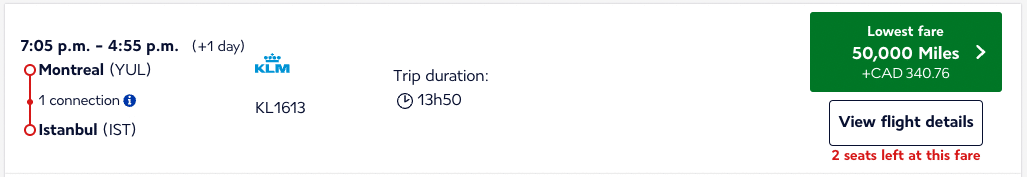 In Canada, Air France KLM Flying Blue is a transfer partner of American Express Membership Rewards at a ratio of 1:0.75. This means that you’ll need to transfer 66,667 MR points to Flying Blue to earn 50,000 Flying Blue miles.