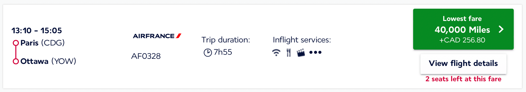 - AF361 Ottawa (YOW) to Paris (CDG), departing 5:05pm and arriving 6:15am the next day