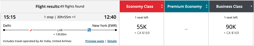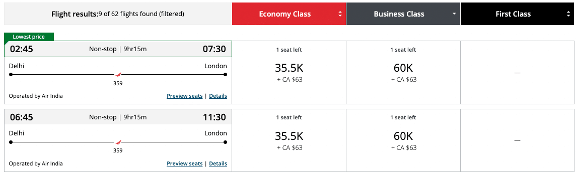In economy, you can expect to pay 35,500 Aeroplan points, or 60,000 points in business class for a flight between Delhi and London. Indeed, these prices are what we find on the Aeroplan website.