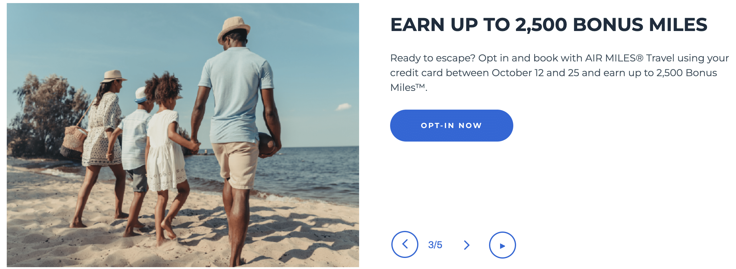 Until October 25, 2023, you can earn up to 2,500 Air Miles by making an eligible booking through the Air Miles Travel Portal. Keep in mind that you must opt in through the Air Miles website, or on the app, and just keep an eye out for the below image..