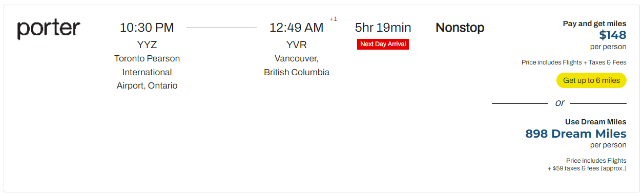 For example, a Porter Airlines flight from Toronto to Vancouver costs $148 (all values in CAD), or 898 Dream Miles plus $59 in taxes and fees. As a Blue member, you may now use as few as 449 Dream Miles to cover half the fare.