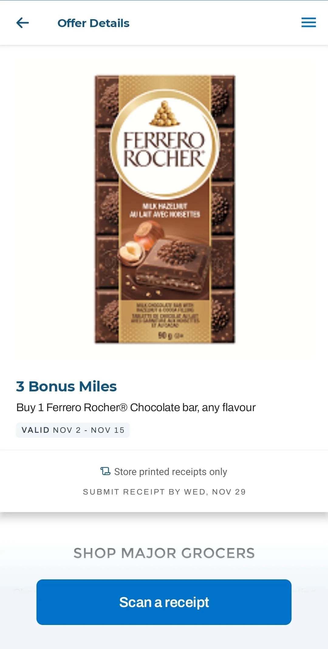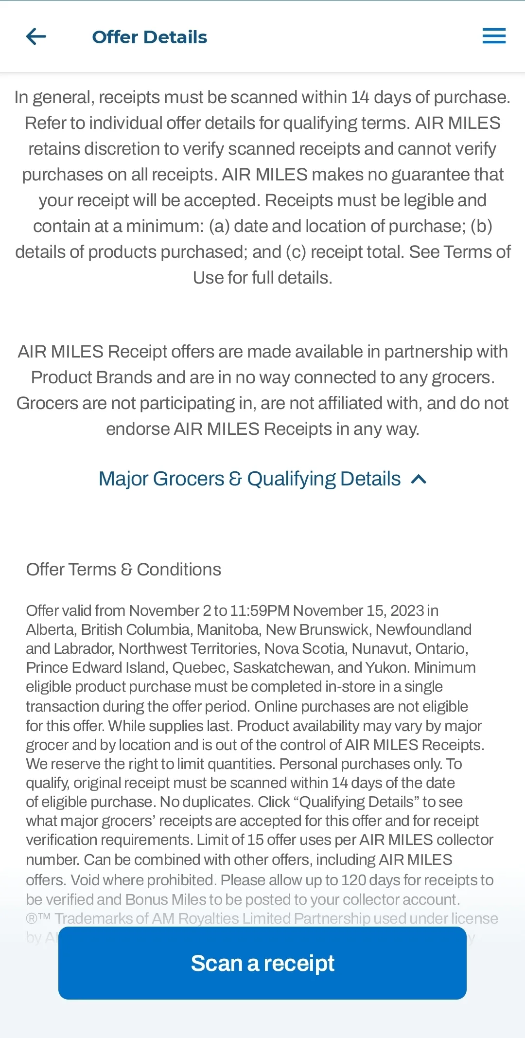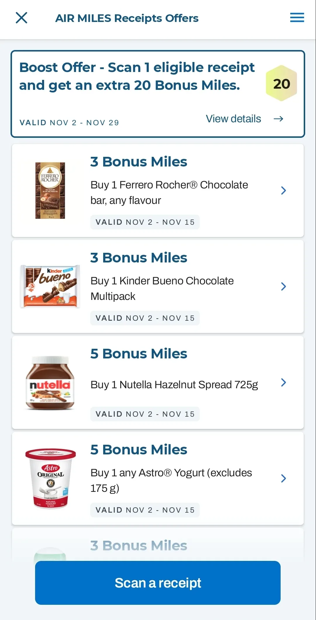 AIR MILES enthusiasts can earn bonus AIR MILES by scanning a receipt from an eligible grocery store into the AIR MILES app. If eligible products are listed on the receipt, the member will earn bonus AIR MILES on the purchase accordingly.