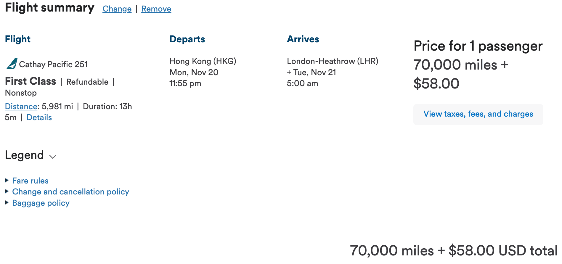 For example, flying Japan Airlines First Class between Tokyo and New York currently costs 70,000 miles, which is the same cost as flying Cathay Pacific First Class between Hong Kong and New York.