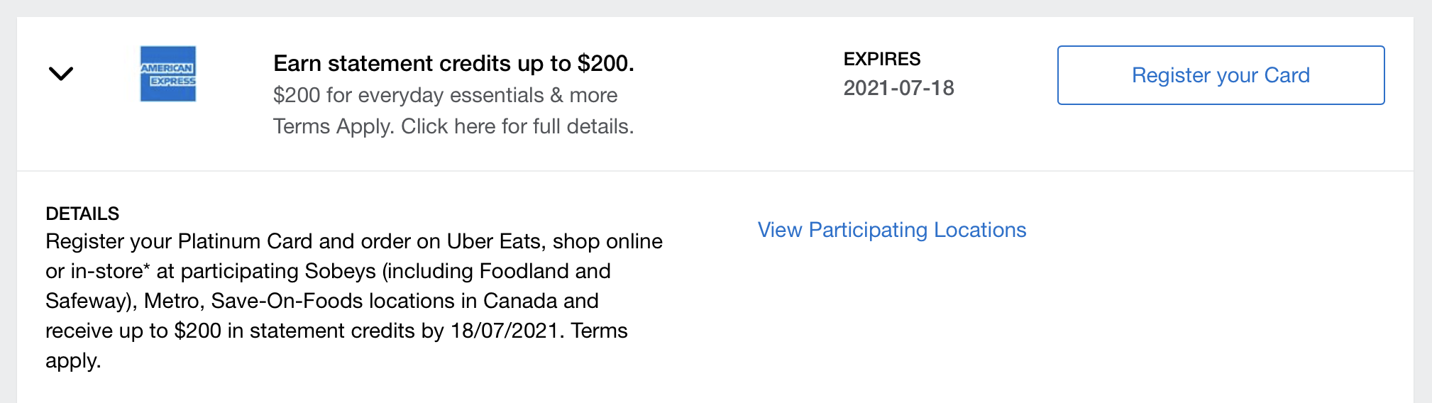 It’s awesome to see one of the best Amex Offers of 2020 returning for another round. If you hold the American Express Platinum Card, you can earn $200 in statement credits towards your everyday essentials at Sobeys, Metro, Save-On-Foods, and Uber Eats. Go ahead and register for the offer if you haven’t already, and then hit up the shops or the Uber Eats app and get spending!