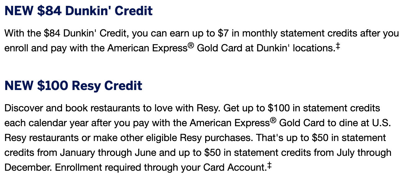 Aside from the increased annual fee, the most notable change with this American Express® Gold Card refresh comes in the form of dining rewards, with new credits added from Dunkin’ and from Resy, an online restaurant reservation service.