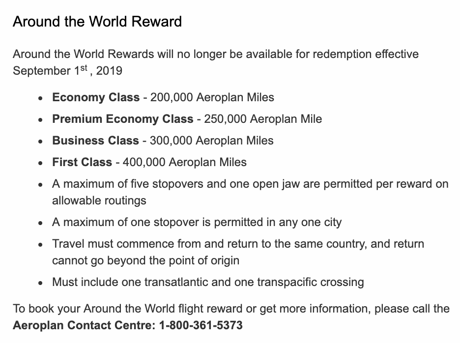 Yesterday I made a video on the Aeroplan Mini-RTW, and today we learn that the Aeroplan Mini-RTW will be reduced significantly as of September 1, 2019.