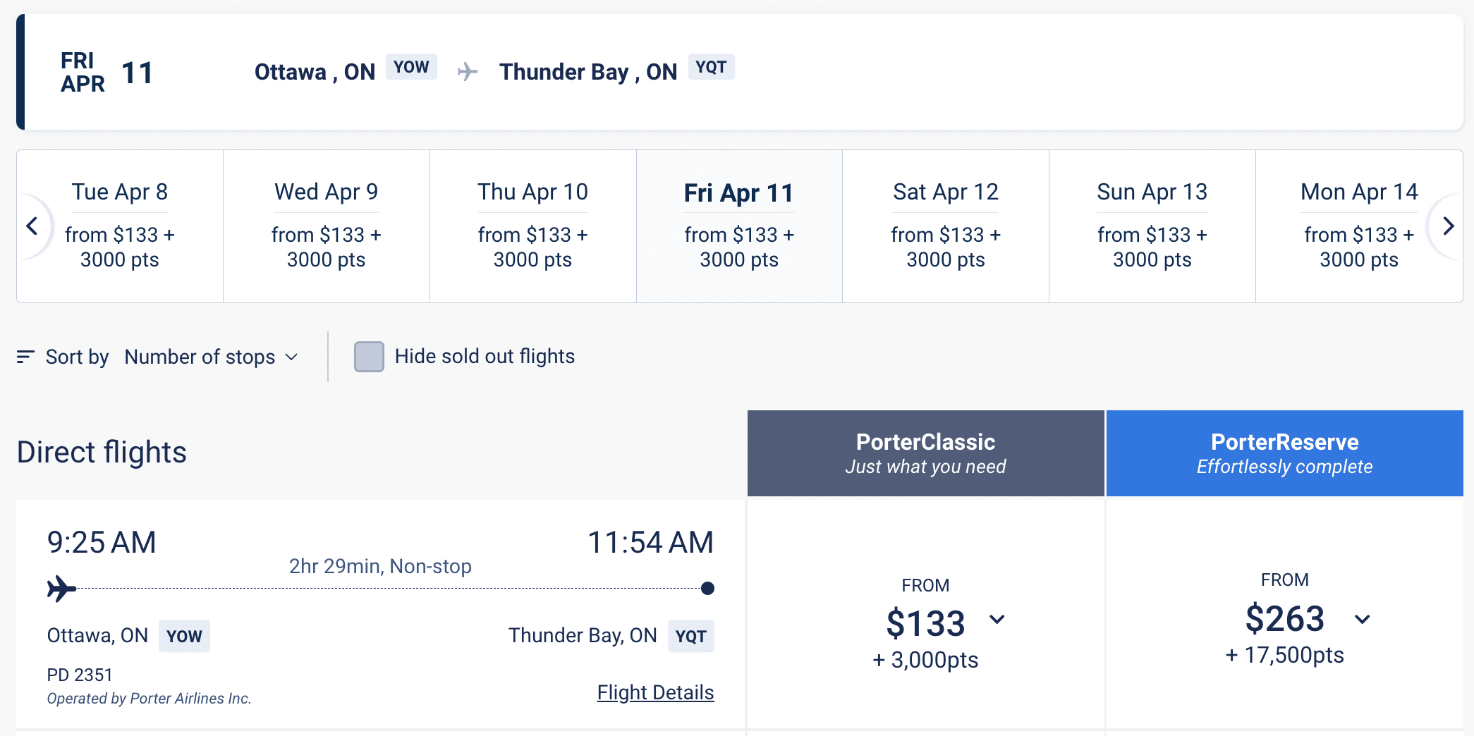 For example, a flight from Ottawa (YOW) to Thunder Bay (YQT) costs $283. But using cash+points option, it drops to $133+3,000 VIPorter points – effectively redeeming VIPporter points at a value of 5 cents per point.