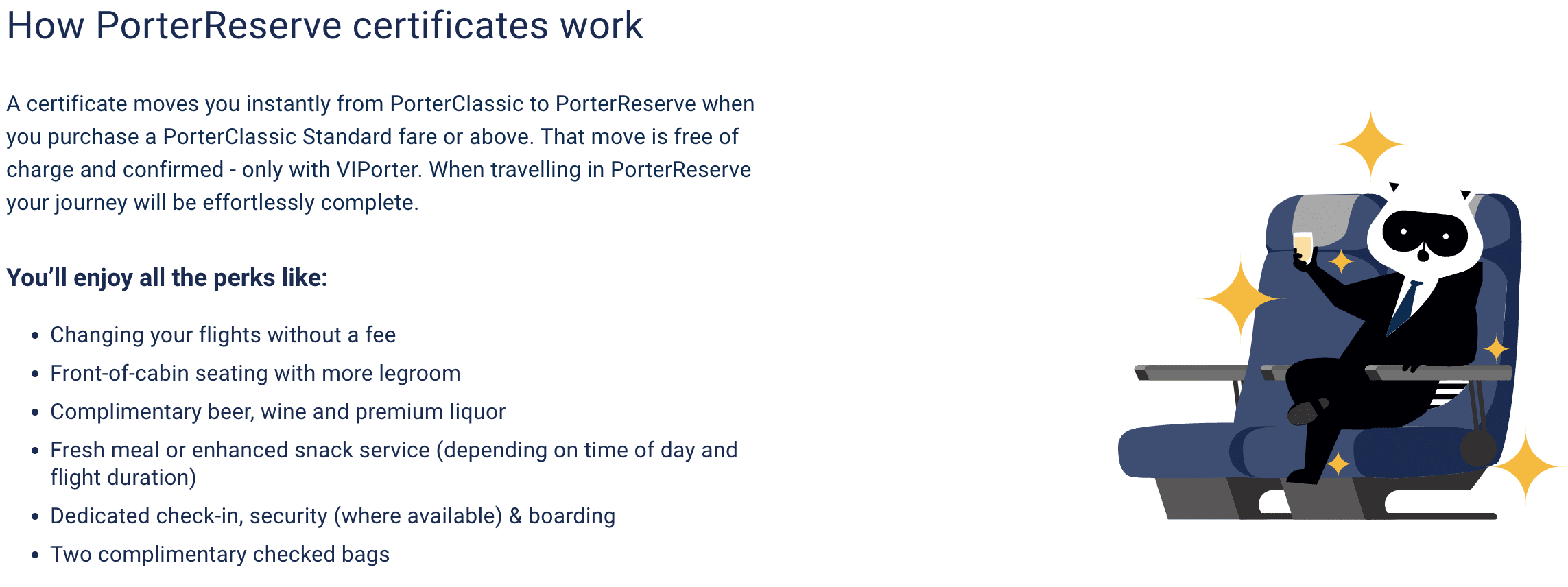 - Complimentary PorterClassic seat selection (rows 8+) for up to 2 passengers