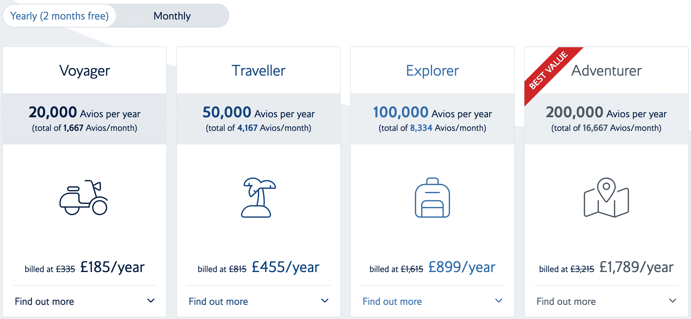 Regardless of whether you choose the annual or monthly billing, Avios would flow in monthly. For example, under the highest-tier Adventurer plan for 200,000 Avios, this would be 16,667 Avios per month for 12 months.