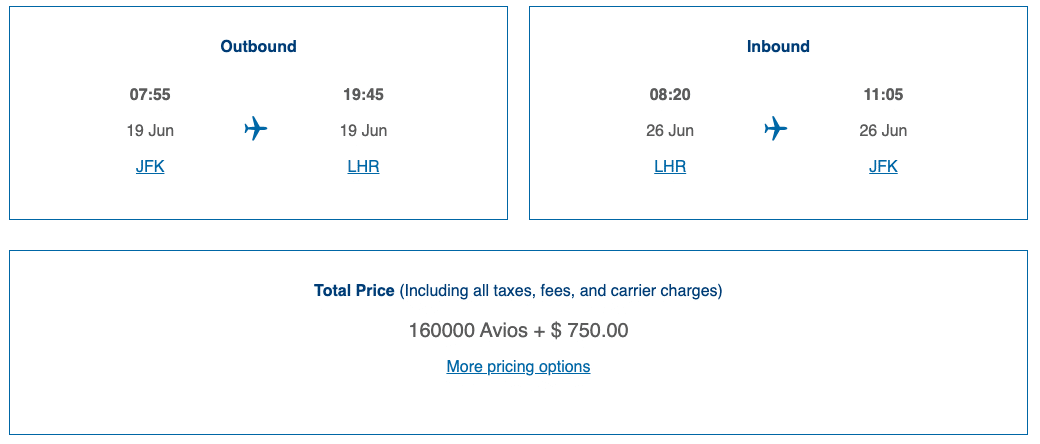 Previously, you’d pay 160,000 Avios and $700 (USD) for a round-trip booking between New York and London with British Airways, as shown in the below chart.