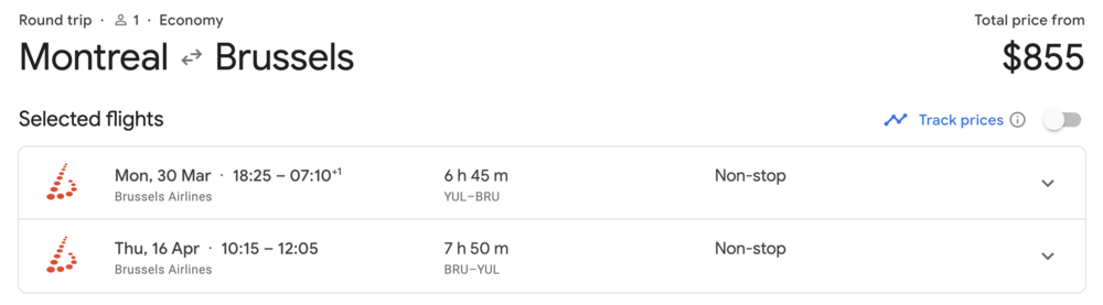 SN562 Montreal to Brussels, departing 6:25pm and arriving 7:10am the next day, M/Th/F/Sa/Su