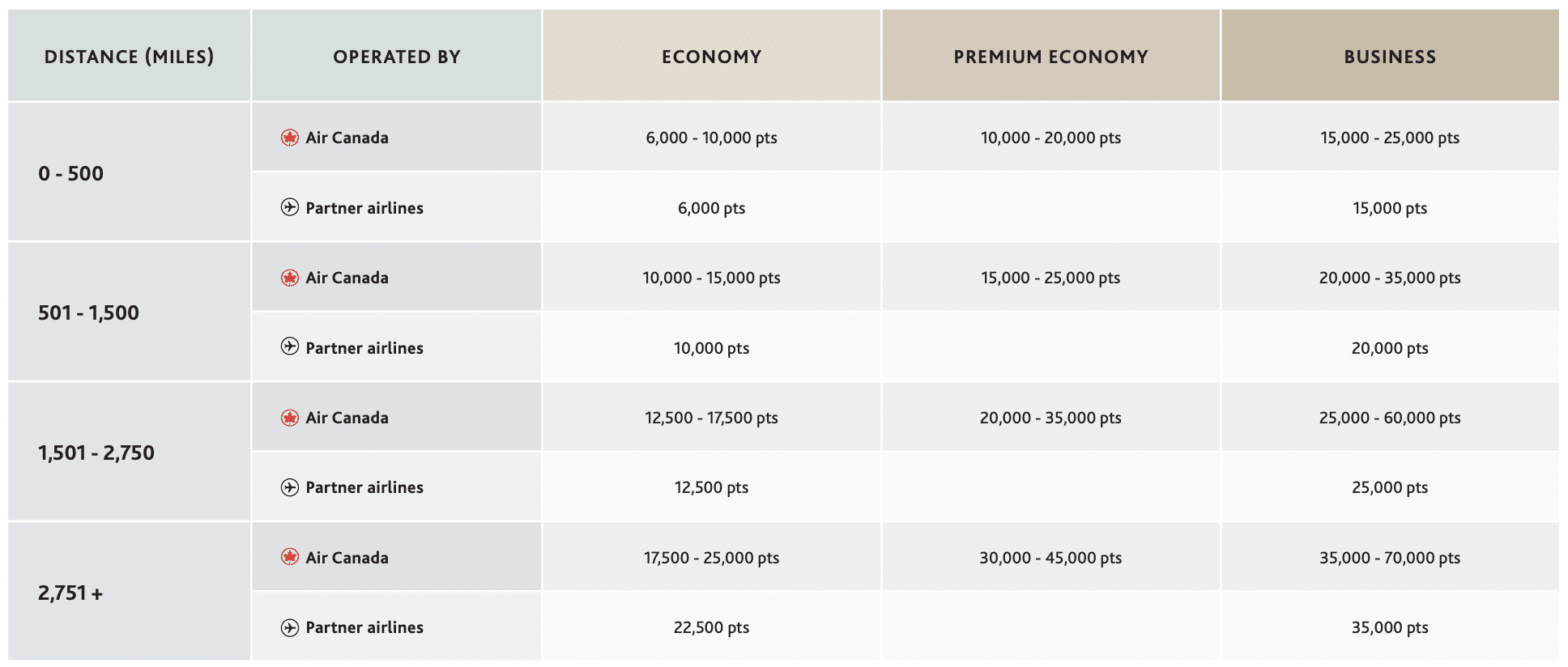 On the Aeroplan Flight Reward Chart, this falls within the third distance band on the “Within North America” chart. As displayed, booking with partner airlines will cost a predictable 12,500 Aeroplan points in economy.