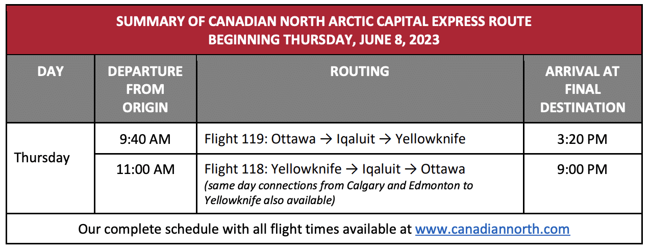 Canadian North has launched the Arctic Capital Express route, which will provide a same-day service between Ottawa (YOW), Iqaluit (YFB), and Yellowknife (YZF) in both directions. The flights are set to begin on June 8, 2023, and travel will take place on Tuesdays and Thursdays.
