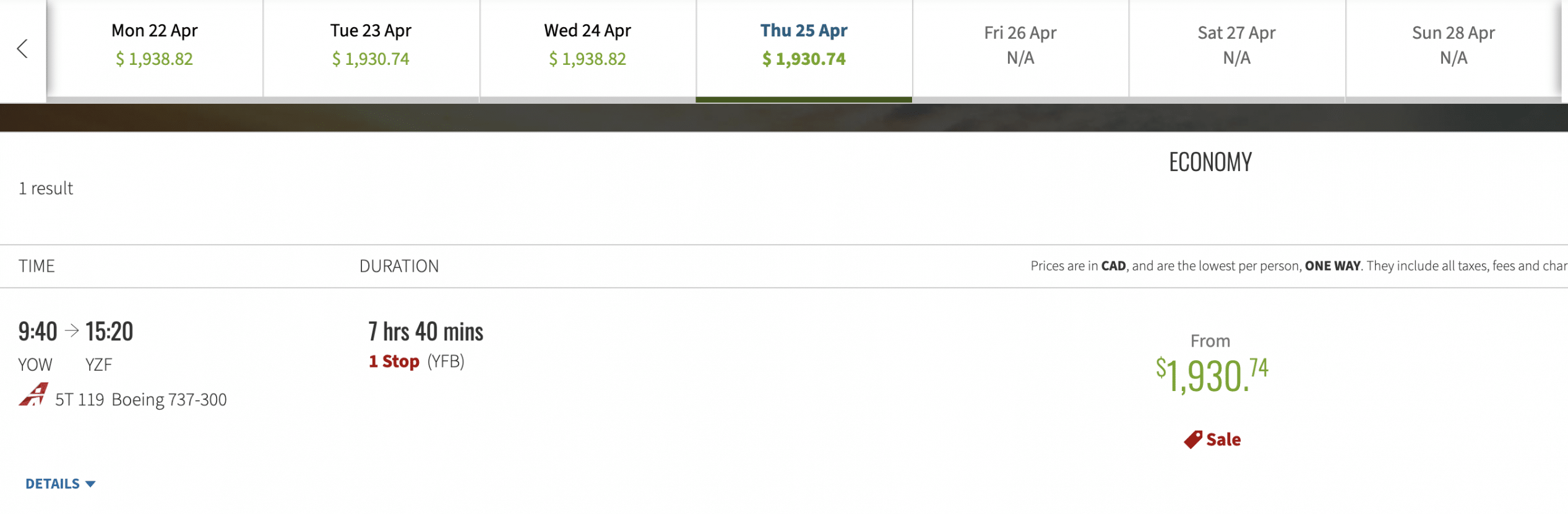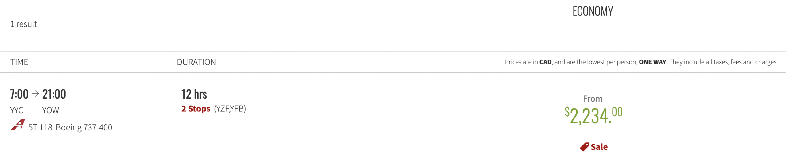 For example, a cash fare for flights from Ottawa (YOW) to Yellowknife (YZF) with Canadian North start at around $1,900 (CAD), and can venture all the way up to $3,100 (CAD).