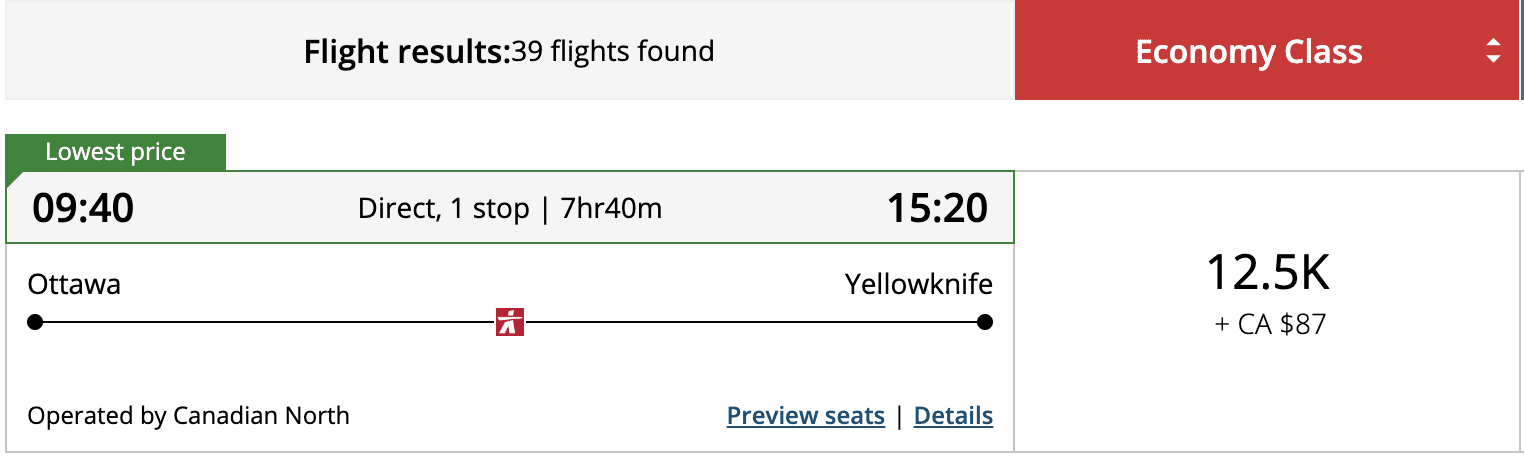 Since Canadian North is an Aeroplan partner, you can also redeem Aeroplan points on the Arctic Capital Express route. As cash prices on this route tend to run quite high, you stand to benefit from fixed pricing using Aeroplan points, which can result in a spectacular redemption value.