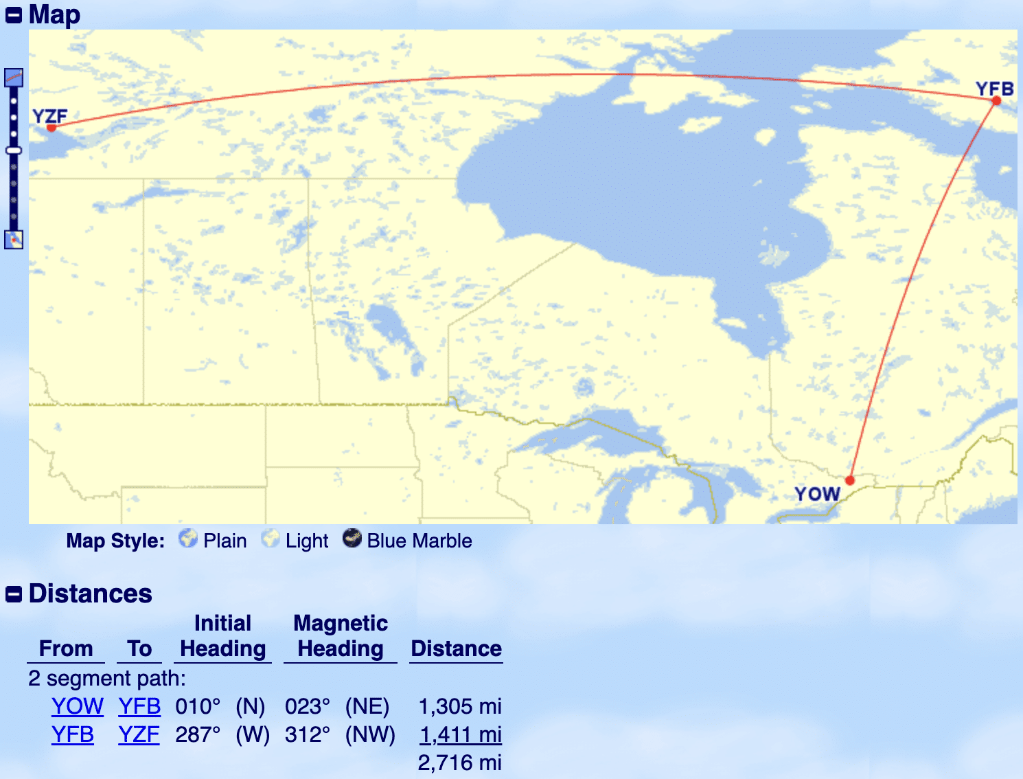 Let’s use the same example of a one-way booking from Ottawa (YOW) to Yellowknife (YZF). According to Great Circle Mapper, the total distance flown amounts to around 2,716 miles.
