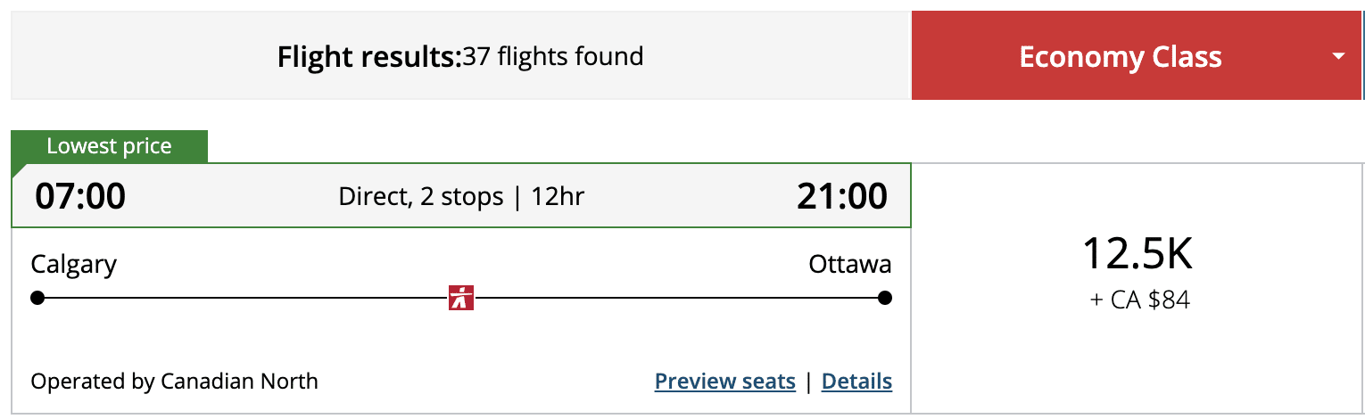 Lastly, should you wish to fly from Calgary (YYC) to Ottawa (YOW) via Yellowknife (YZF) and Iqaluit (YFB), you’ll be happy to know that you can also book this with Aeroplan points.