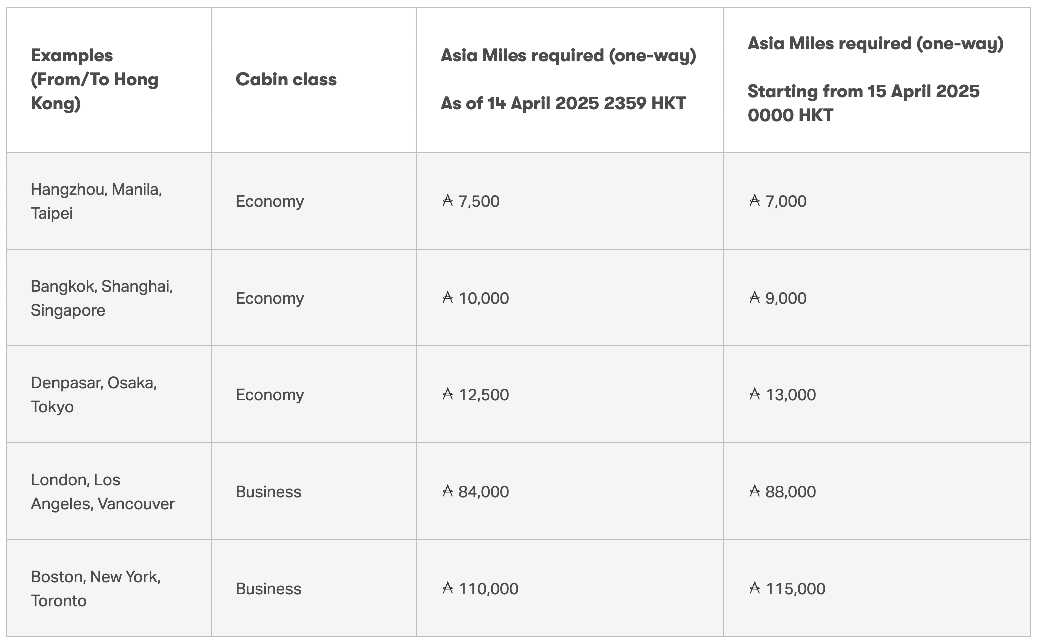 On April 15, 2025 at midnight Hong Kong Time, Cathay Pacific Asia Miles is making some adjustments to its award chart.