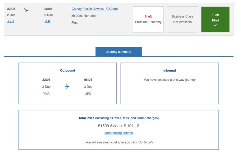 This means that it’s been possible to book a First Class flight from New York to Vancouver, do a stopover in Vancouver, and then continue on to Hong Kong in First Class before flying onwards to anywhere else in Asia, the Middle East (Dubai, Bahrain, or Tel Aviv), or South Africa (Johannesburg or Cape Town) – in First Class if it’s available, otherwise in business class – all for 70,000 Alaska miles!