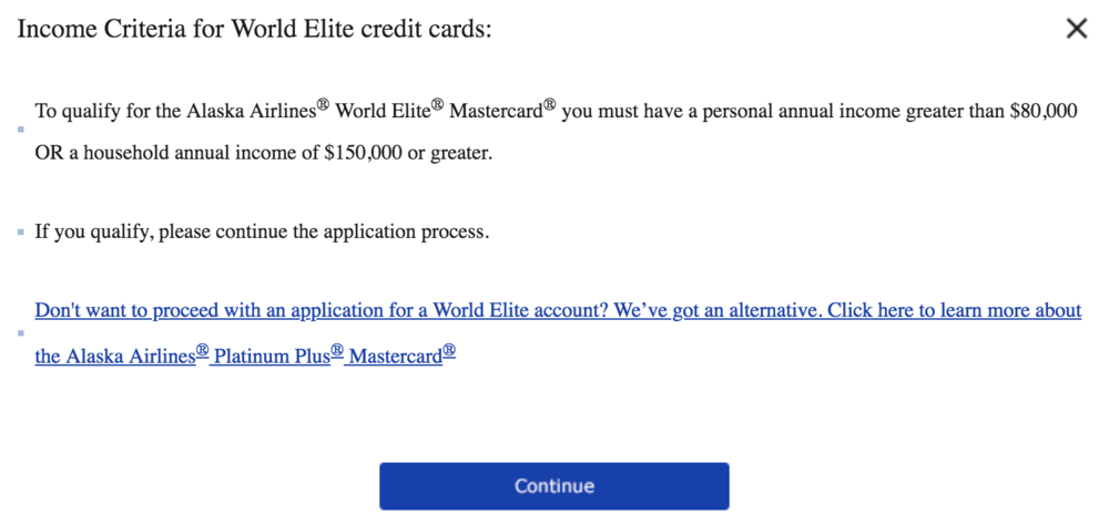 In the past, there was a single application process for the MBNA Alaska Airlines MasterCard. If your income was greater than $80,000, you’d be automatically sent the World Elite version of the card (assuming you’re approved, of course); otherwise, you’d receive the Platinum Plus version.